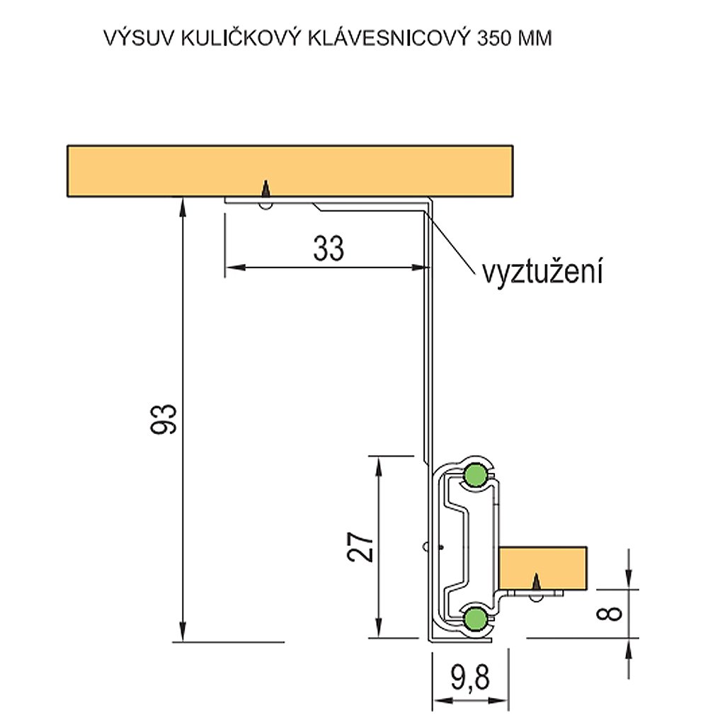 Výsuv guličkový - na klávesnicu, čierny, 350 mm