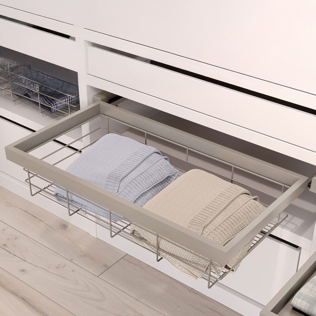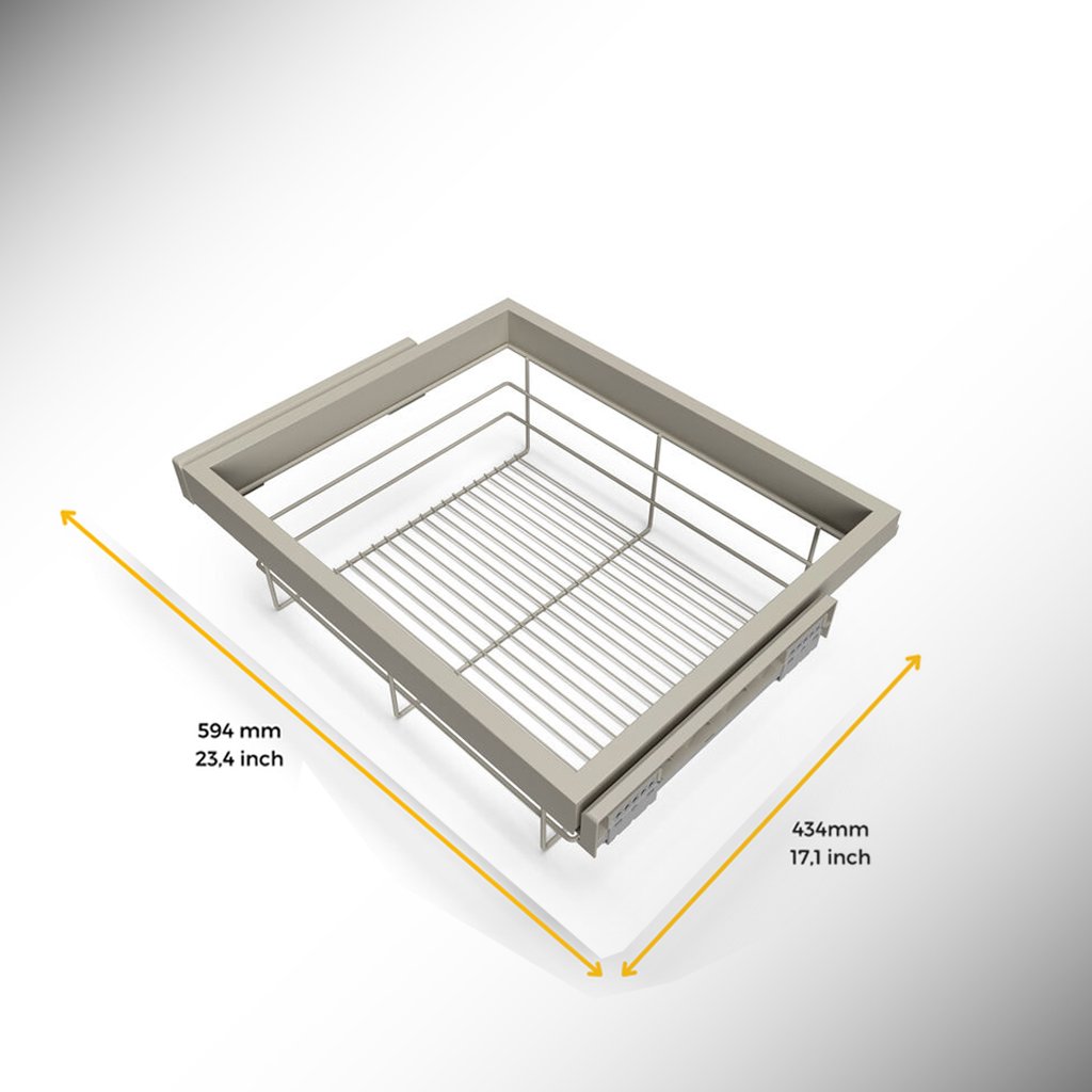 Výsuvný košík dostupný v čiernej a béžovej farbe je praktický a štýlový doplnok pre moderné šatníkové systémy. Vďaka nastaviteľnému rámu, mäkkému zatváraniu a pevnej drôtenej konštrukcii ponúka efektívne usporiadanie priestoru a jednoduché používanie.