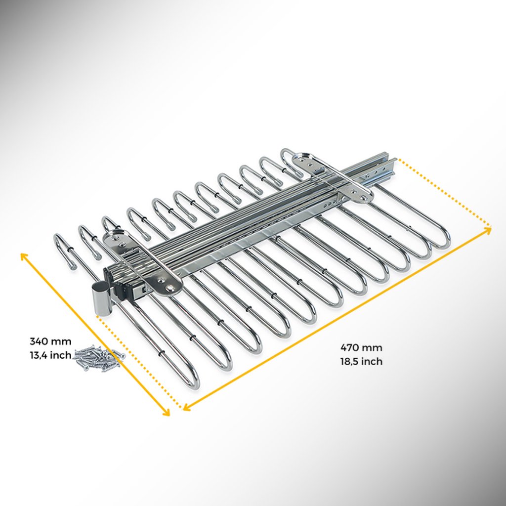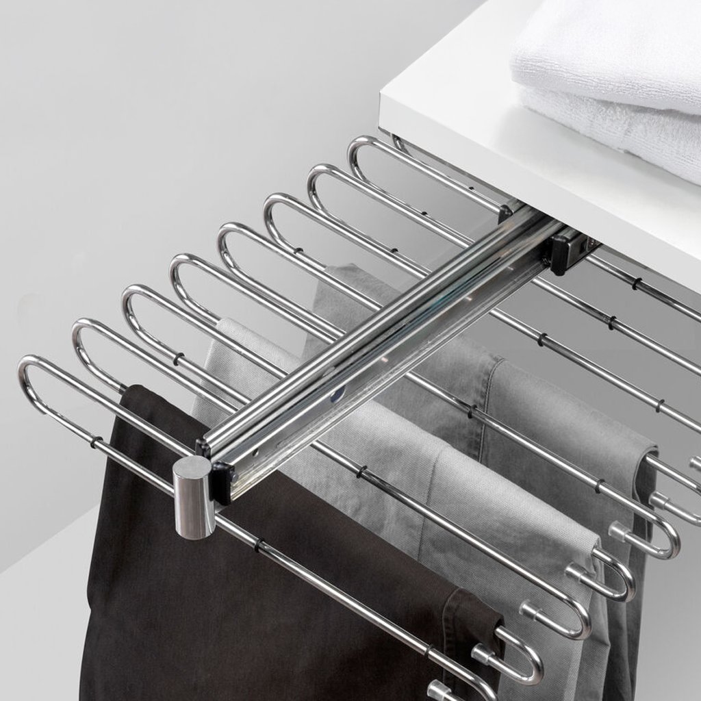 Výsuvný stojan na nohavice je ideálny doplnok pre šatníky a walk-in skrine. Umožňuje efektívne usporiadanie a jednoduchý prístup k nohaviciam. Vyrobený z chrómovej ocele, dostupný v lesklom chróme, čiernej a sivej farbe, stojan ponúka funkčnosť, trvácnosť a estetiku.