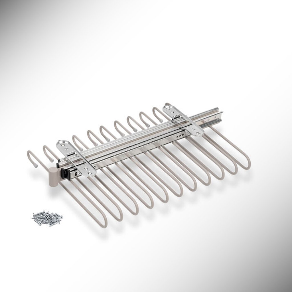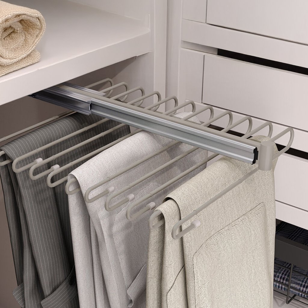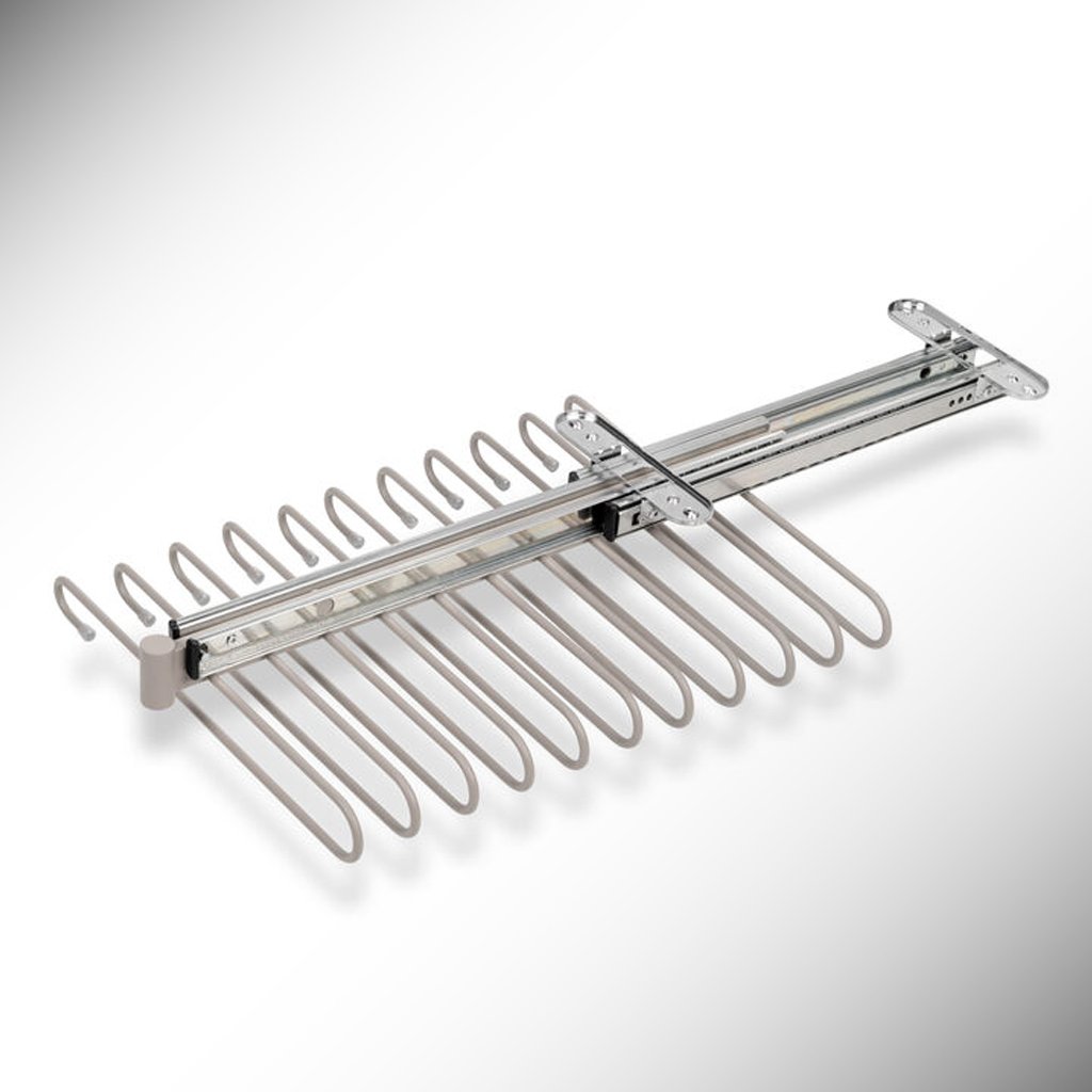 Výsuvný stojan na nohavice je ideálny doplnok pre šatníky a walk-in skrine. Umožňuje efektívne usporiadanie a jednoduchý prístup k nohaviciam. Vyrobený z chrómovej ocele, dostupný v lesklom chróme, čiernej a sivej farbe, stojan ponúka funkčnosť, trvácnosť a estetiku.