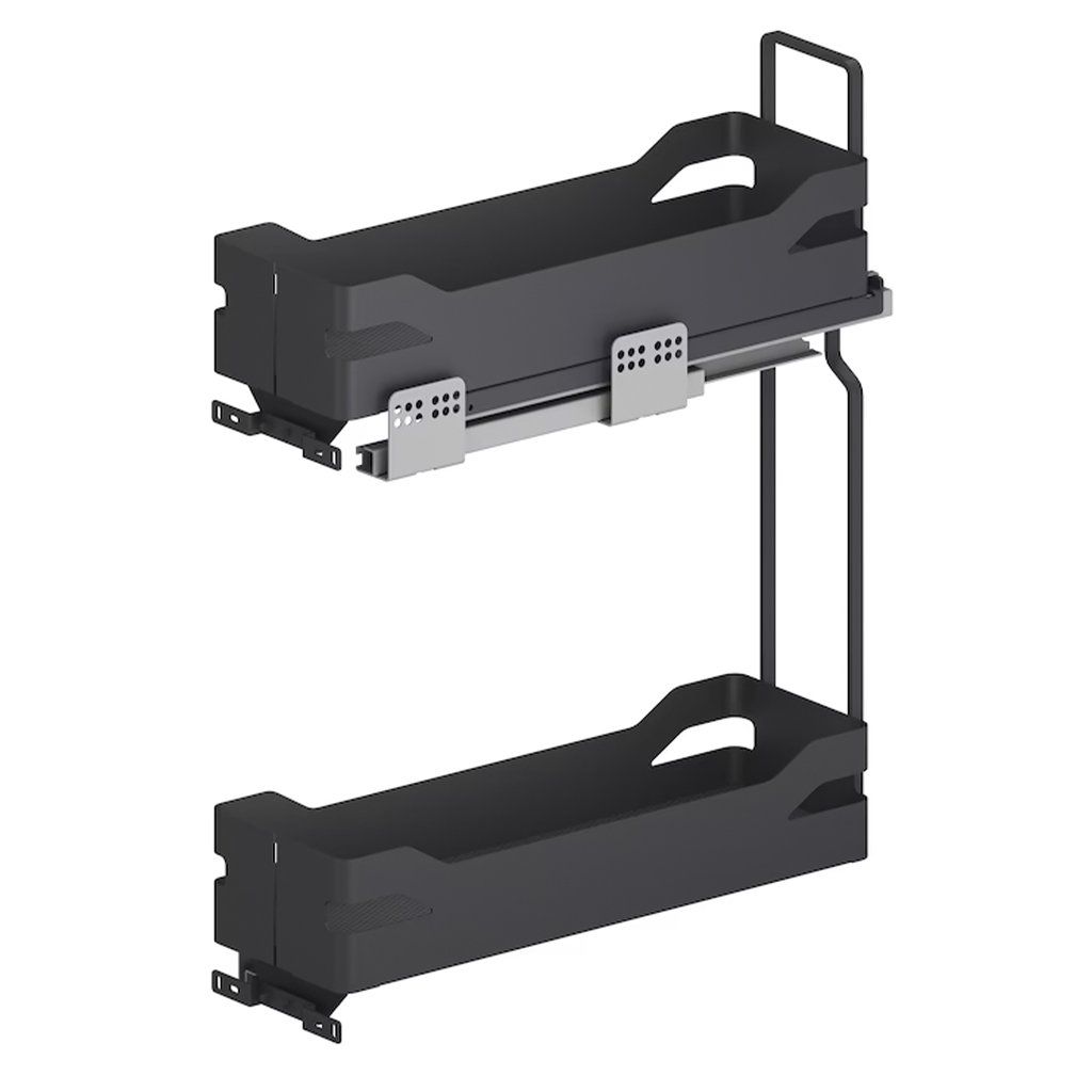 Plnovýsuvný dvojkoš WIRELI Style je prémiový úložný systém určený pre spodné kuchynské skrinky so šírkou 300 mm. Vďaka svojej úzkej a efektívnej konštrukcii umožňuje šikovne využiť priestor, ktorý by v bežnej kuchyni zostal nevyužitý. Dvojúrovňové riešenie poskytuje dostatok miesta na ukladanie olejov, korenín, fliaš či kuchynských doplnkov.